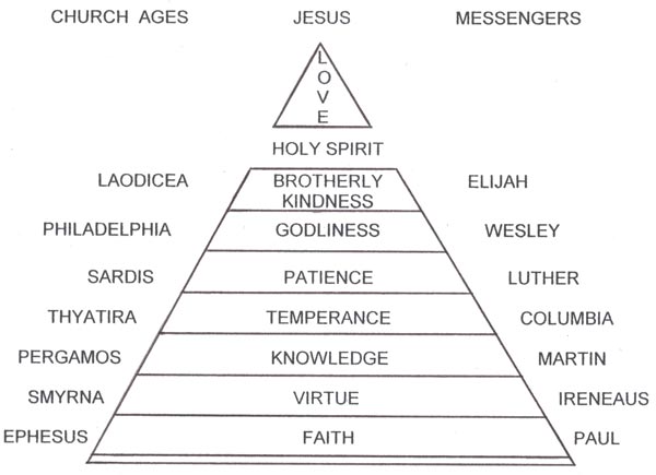 Brother Branham drew a diagram to which he refers to throughout his ministry. We understand that this diagram is twofold, it pertains to the seven church ages, and also to the individual believers of the end-time Message. The Holy Spirit (between Brotherly Kindness and Love) will cap and seal the saints individually into the full stature of Christ to make us ready for the day of Redemption. But the Capstone (Love) is the coming corporal Lord Jesus to judge, claim, save, and redeem all the saints of all ages, and to cap off the Church by taking His Own Throne in the heart of each member.